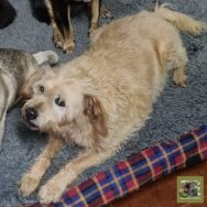 Na impossibilidade, mais uma vez, de publicarmos directamente no nosso álbum “Céu de Cão”, é com enorme tristeza que, desta forma, participamos que a nossa querida KINA não resistiu, e deixou-nos durante a madrugada de sábado. Como aqui tínhamos noticiado, a KINA foi internada na passada sexta feira, devido a dificuldades respiratórias, que supunhamos serem decorrentes de uma obstrução pulmonar crónica de que sofria há já alguns anos. No entanto, e para nossa enorme surpresa, no raio X realizado foi detectada uma grande massa, que uma ecografia revelou situar-se numa extensa área que abrangia a vesícula biliar, o estômago, e o esófago, e que estava a comprimir todo o trato respiratório, incluindo a traqueia e a laringe, causando-lhe significativa dificuldade em respirar. Apesar dos cuidados de emergência administrados, que incluíram oxigenoterapia, o estado da nossa KINA agravou-se rapidamente, e o desfecho, infelizmente inevitável, não tardou. A KINA tinha 16 anos, e já estava connosco há muito tempo, tendo sido resgatada da rua, onde estava a ser atacada por outros cães (com dono, mas que os deixava deambular no exterior…, aqui em Riba de Ave. Era ainda relativamente jovem, então, e mostrava-se, inicialmente, um pouco agressiva com os outros cãopanheiros, com excepção de dois ou três, com quem brincava muito. Foi entretanto esterilizada, e, com o tempo, foi-se tornando mais sociável, o que foi muito bom, porque, num exame de rotina, foi-lhe detectada a tal obstrução pulmonar, decorrente, talvez, de alguma pneumonia ou pleurisia sofrida no seu passado de cadela errante, e foi necessário pô-la num ambiente mais vigiado, tendo começado a passar os seus dias na “Casa do Sr. José”. Nesta imagem, podem vê-la precisamente nesse espaço, que partilhava com outros cãopanheiros também com problemas de saúde diversos ou idades muito avançadas. Era muito gira, a nossa querida KINA refilona, que gostava muito de se esfregar nas nossas pernas, de um lado para o outro, quando estávamos a tratar daquela “turma”, e vamos sentir muitíssimo a sua falta… mas, na nossa memória e nos nossos corações, permanecerá, bem viva, para sempre!